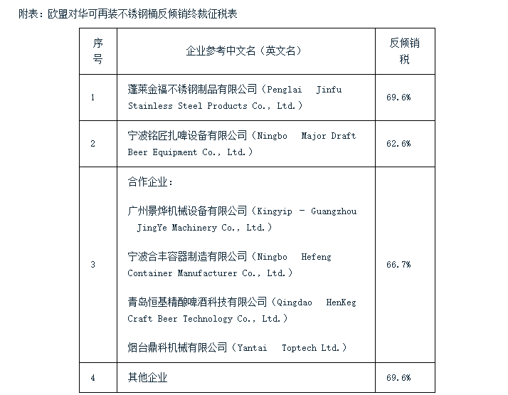 時(shí)間:07/06/2023 09:31:052023年7月4日,歐盟委員會(huì)發(fā)布公告,對(duì)原產(chǎn)于中國(guó)的可再裝不銹鋼桶(Stainless Steel Refillable Kegs)作出反傾銷終裁,裁定對(duì)涉案產(chǎn)品征收62.6%~69.6%的反傾銷稅,稅率詳見附表。涉案產(chǎn)品近似圓柱形,其壁厚大于等于0.5毫米,容量大于等于4.5升,無論飾面類型、規(guī)格或不銹鋼等級(jí),無論是否帶有附加部件(提取器、頸部、桶延伸出的棱或邊或任何其他部件),無論是否涂漆或涂有其他材料,用于盛放液化氣、原油和石油產(chǎn)品之外的材料。涉案產(chǎn)品的歐盟CN(Combined Nomenclature)編碼為ex 7310 10 00和ex 7310 29 90(TARIC編碼為7310 10 00 10和7310 29 90 10)。措施自公告發(fā)布次日起生效。